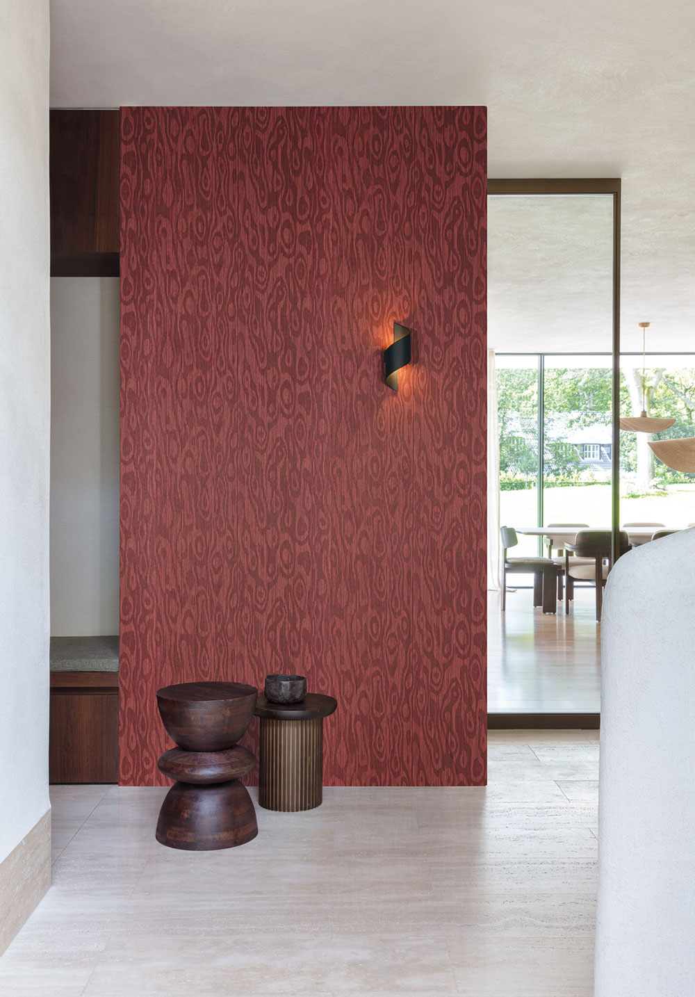 Non-woven wallpaper, semi-gloss pattern evoking imitation wood paneling, burgundy shades.