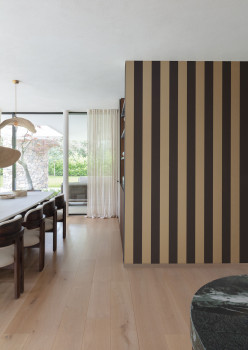Smooth non-woven wallpaper, matte stripes in shades of brown and black.