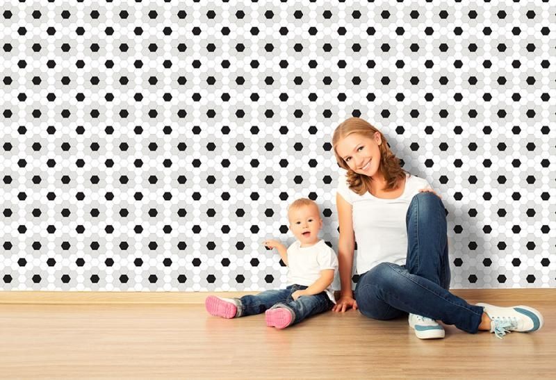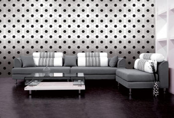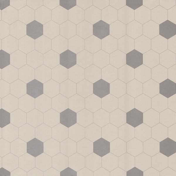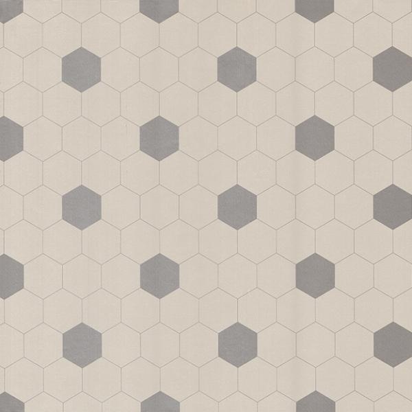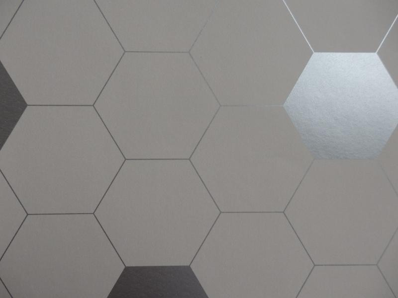 Silver hexagons pattern hemmed with a light gray and beige color on a non-woven wallpaper, Czech production.