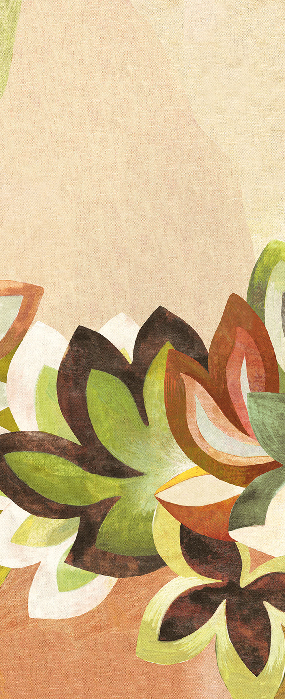 Non-woven wall mural, floral pattern in shades of brown, green, yellow and orange.