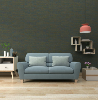 Non-woven wallpaper, imitation of coarser fabric, shades of black, brown and metallic turquoise.