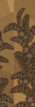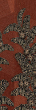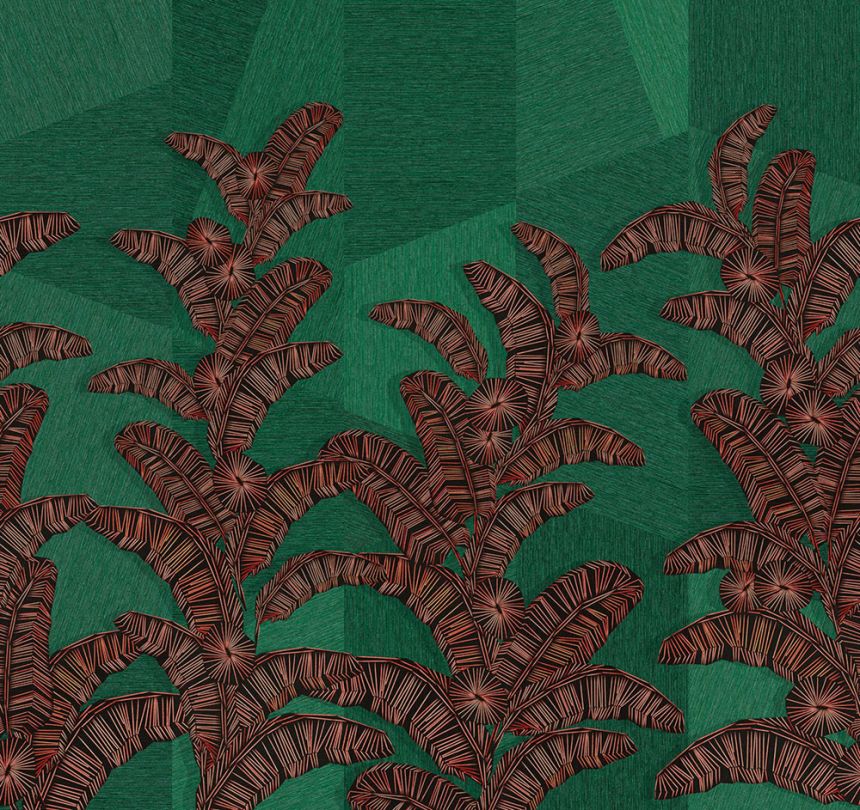 Non-woven wall mural, background evoking coarser textile and lines forming an ethno pattern of leaves, shades of green, brown, brick red.