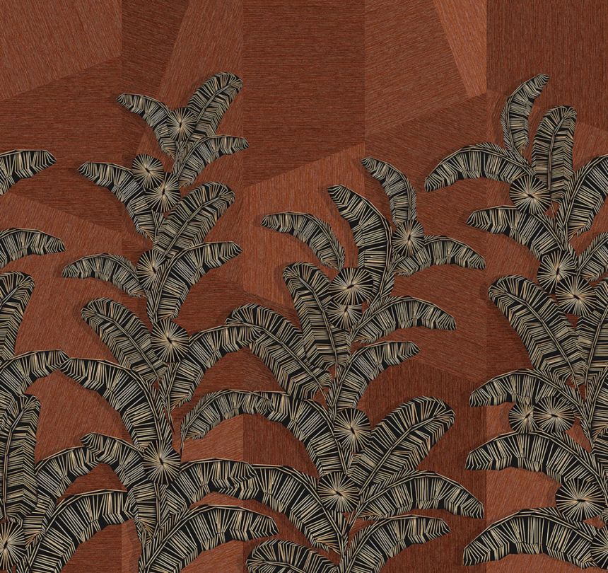 Non-woven wall mural, background evoking coarser textile and lines forming an ethno pattern of leaves, shades of brick red and brown.