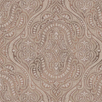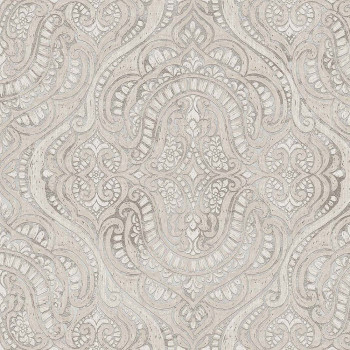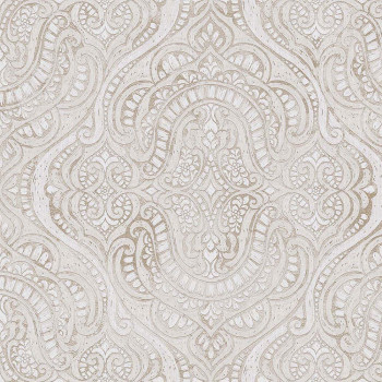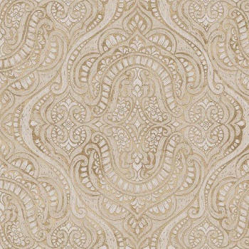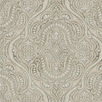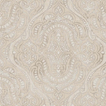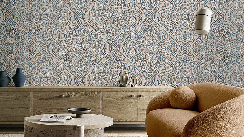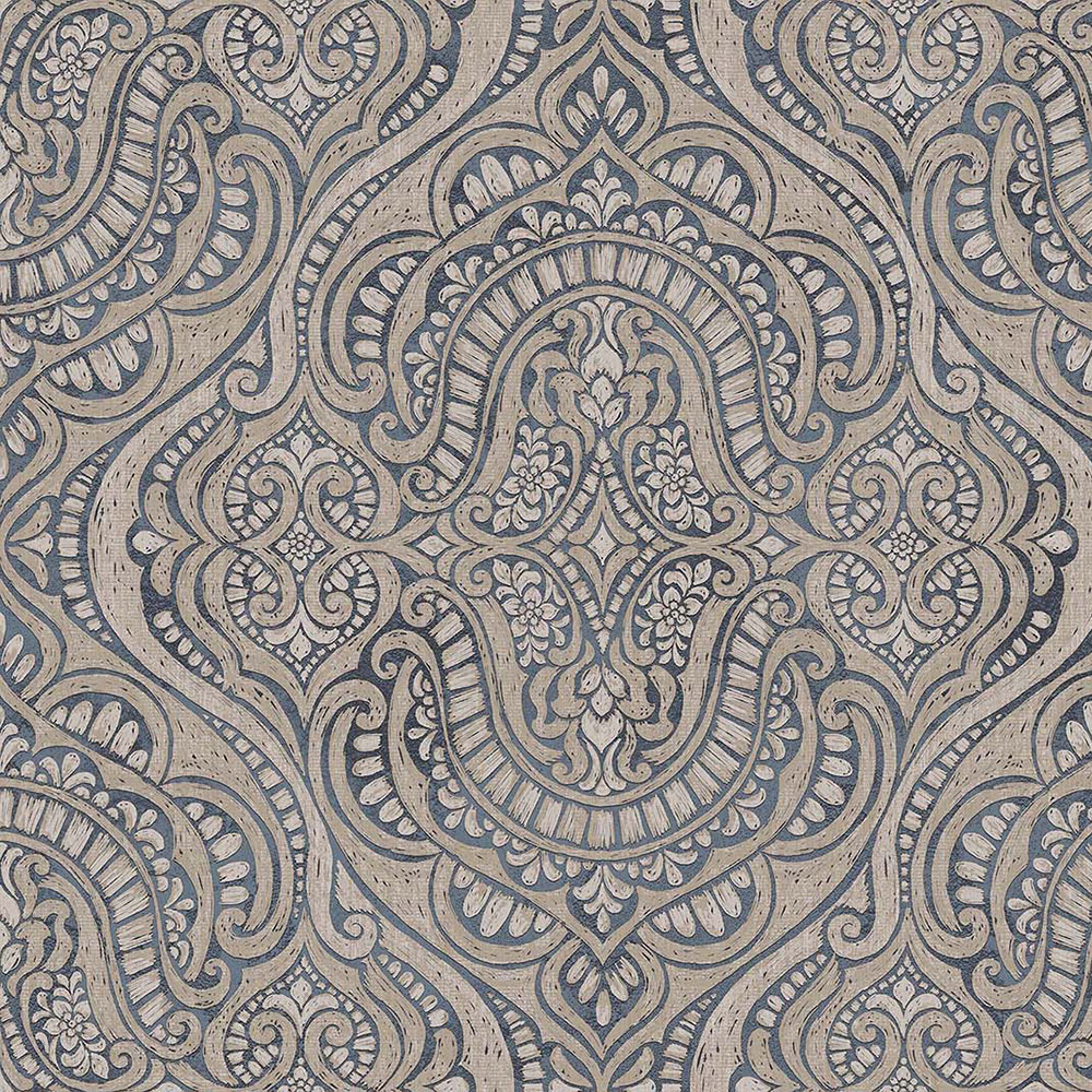 Luxurious, embossed, non-woven wallpaper with vinyl surface, blue background, beige ornamental baroque pattern.