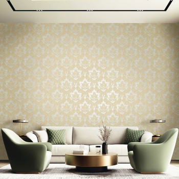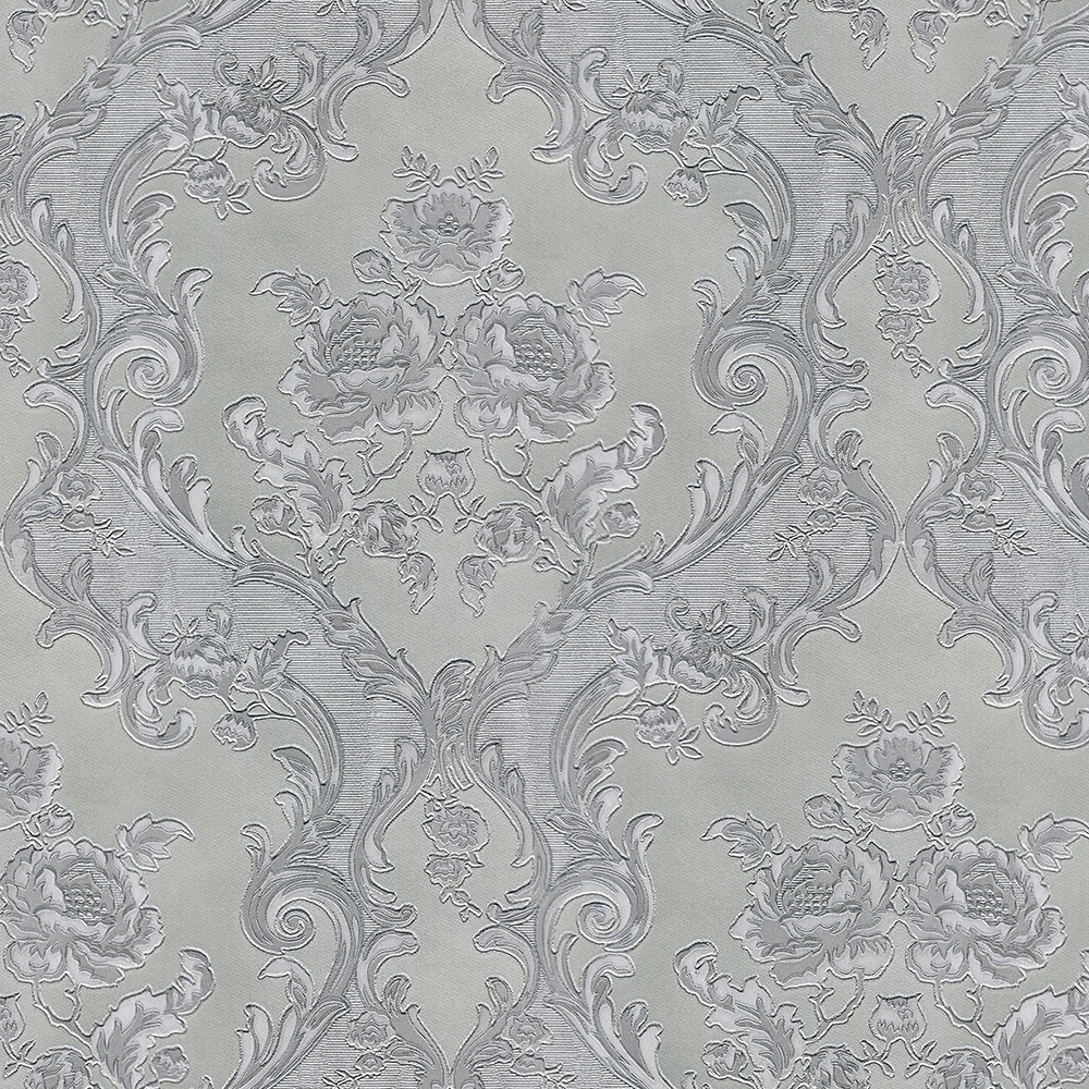 Luxury non-woven wallpaper with vinyl surface, gray-silver background, silver baroque pattern.