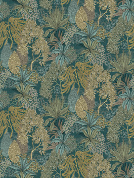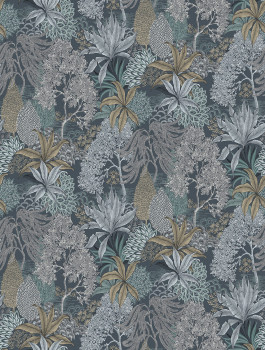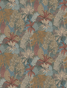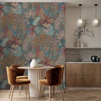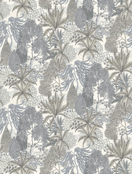 Non-woven wallpaper, plant and leaf motifs in shades of blue and brown.