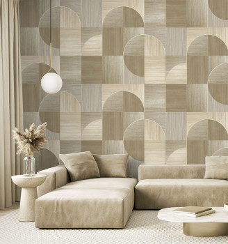 Geometric non-woven wallpaper, shades of grey-beige, evokes wooden wall panelling.
