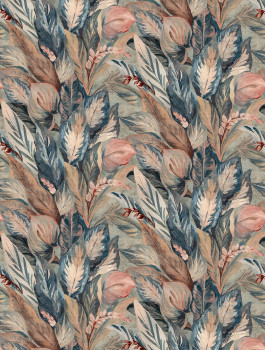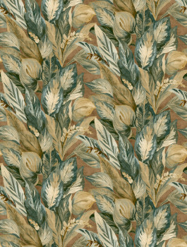 Non-woven wallpaper, leaves in shades of green, brown, beige and ochre.