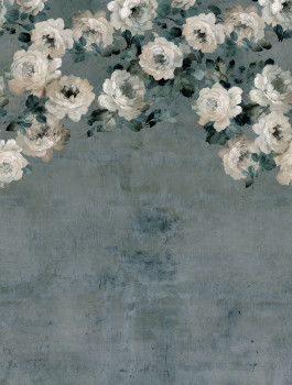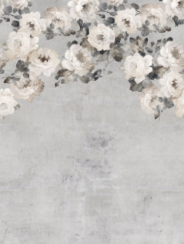 Non-woven wallpaper, floral motif, shades of grey and cream.