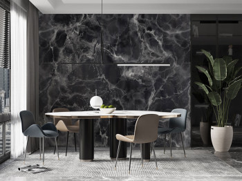 Non-woven wallpaper, marble in shades of black and grey.
