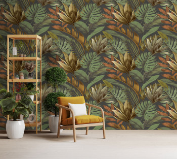 Non-woven wallpaper, tropical leaves in shades of green and brown.