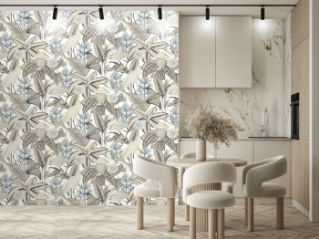 Non-woven wallpaper, tropical leaves and herons, shades of grey-beige.