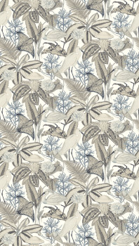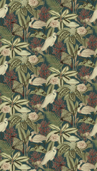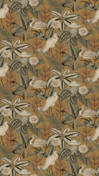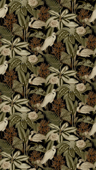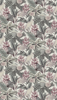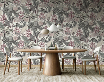Non-woven wallpaper, tropical leaves and herons, shades of mint green, grey, burgundy.