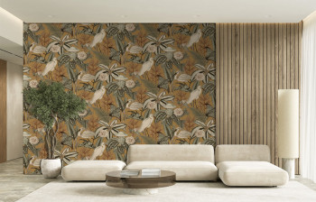 Non-woven wallpaper, tropical leaves and herons, shades of mustard, grey-green and beige.