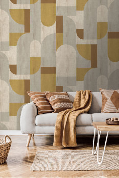 Non-woven wallpaper, geometric patterns in shades of beige, grey and brown.