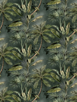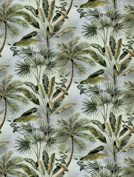 Non-woven wallpaper, palm trees and tropical leaves, shades of grey and green.