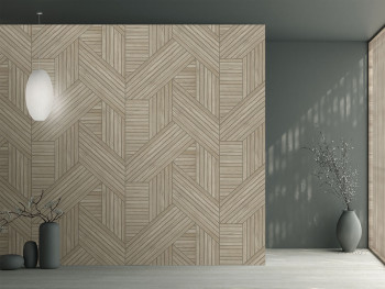 Non-woven wallpaper, imitation of wooden wall paneling / slats, shades of beige, grey-beige.