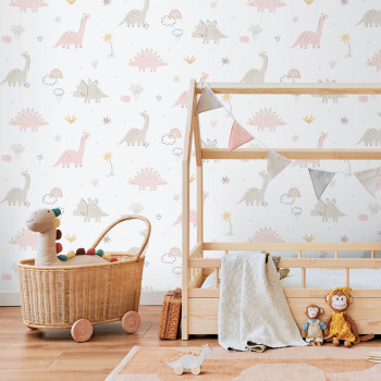Non-woven wallpaper, children's dinosaur motifs in shades of pink, gray-beige and ochre, texture of very fine fabric.