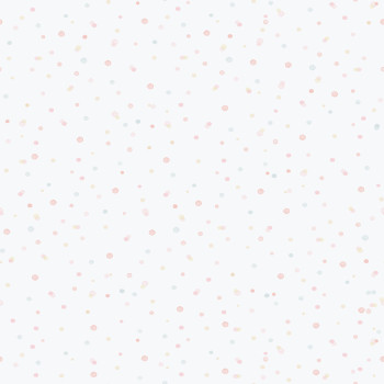 Non-woven wallpaper, motifs of colored dots / specks in shades of pink, blue and yellow, texture of very fine fabric.