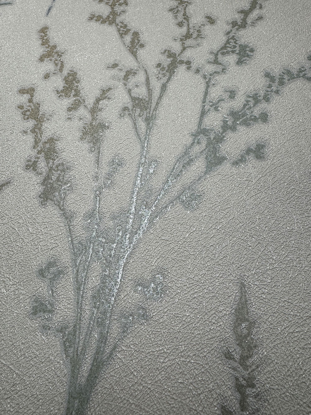 Non-woven wallpaper with vinyl surface, pattern of meadow flowers and grasses in shades of semi-gloss white, gray, blue and green - fine fibrous texture.