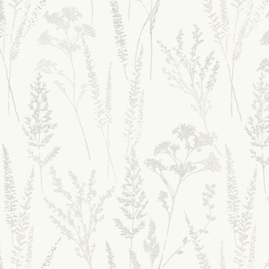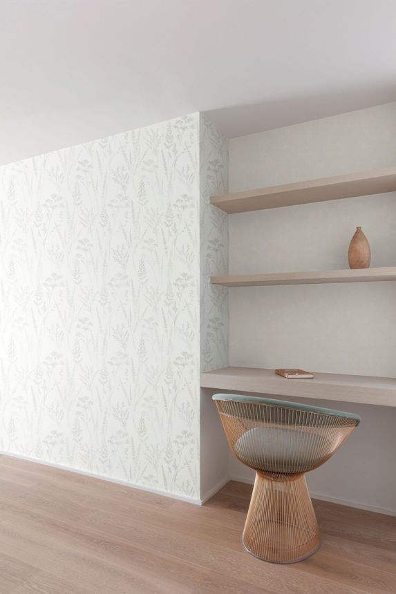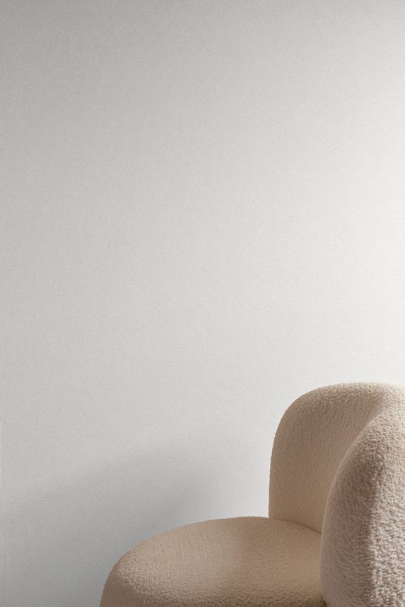 Non-woven wallpaper with vinyl surface, white semi-gloss with fine fibrous texture.
