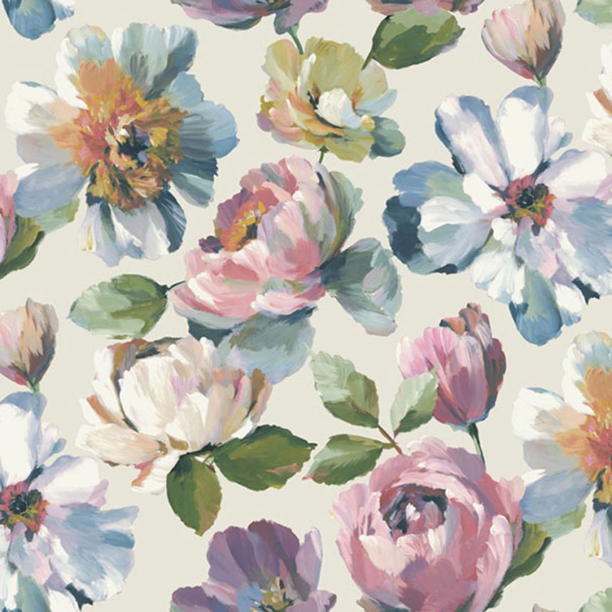 Non-woven wallpaper with vinyl surface, floral pattern in shades of gray, pink, green, blue and purple - fine fibrous texture.