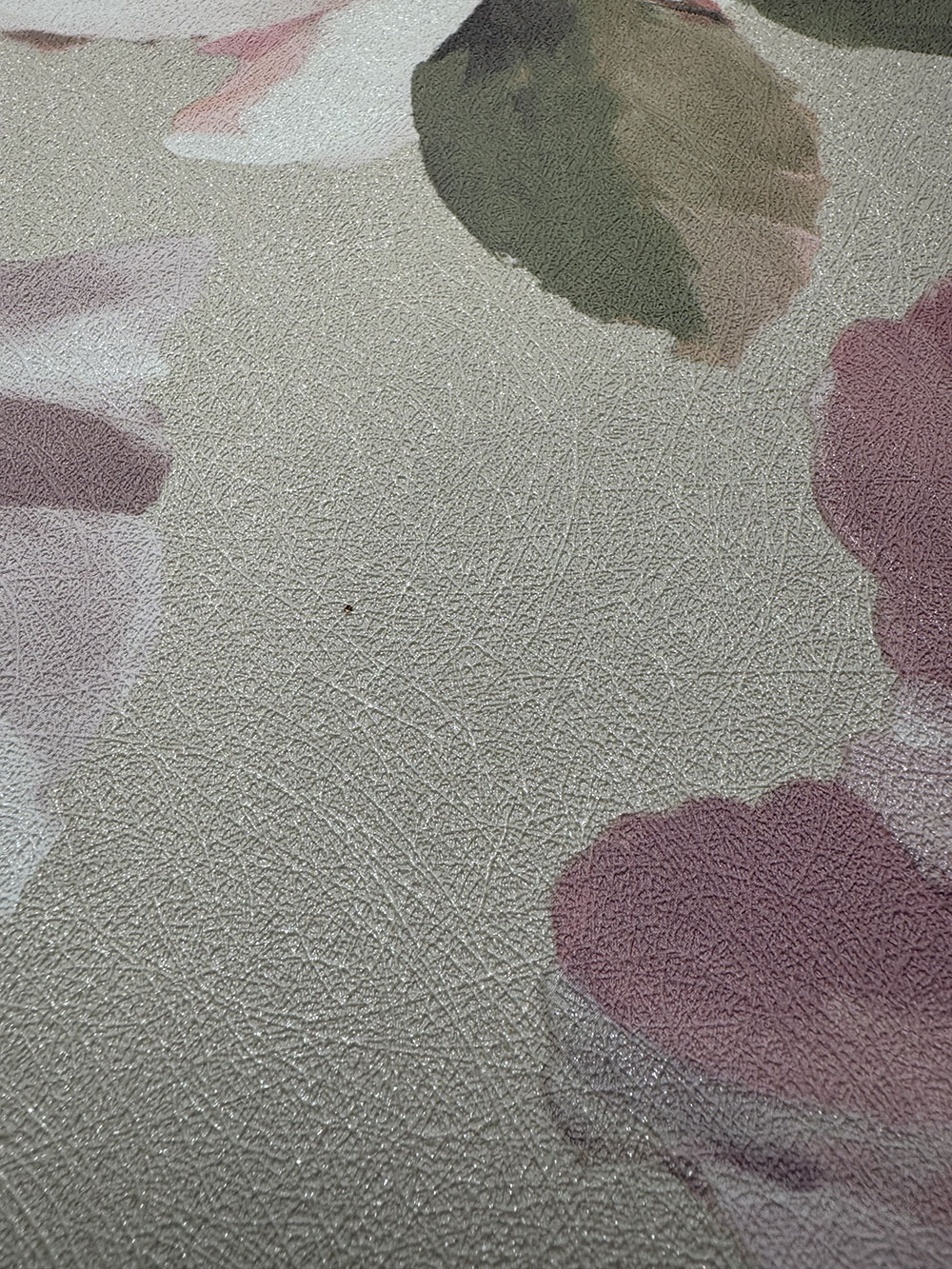 Non-woven wallpaper with vinyl surface, floral pattern in shades of beige, pink, green - fine fibrous texture.