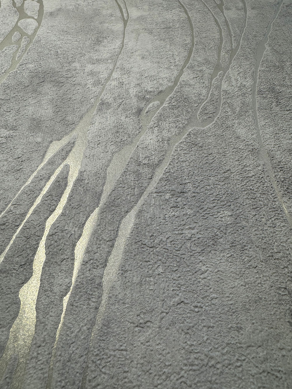 Non-woven wallpaper with vinyl surface, imitation of stucco / concrete in shades of gray-white, embossed metallic lines.