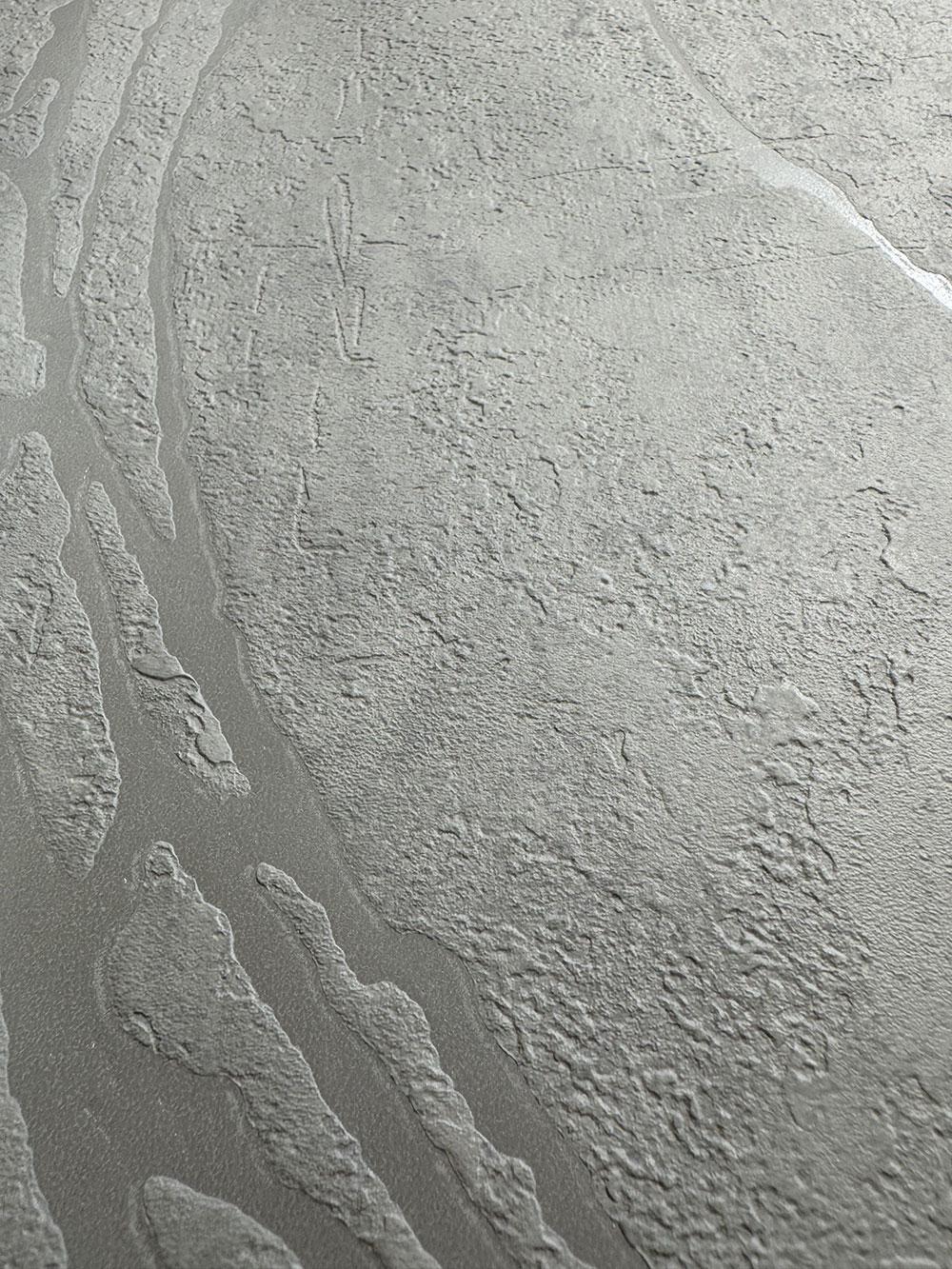 Non-woven wallpaper with vinyl surface, imitation stucco / concrete in shades of white and light gray, semi-gloss embossed lines.