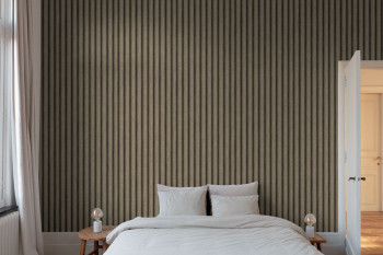 Non-woven wallpaper with vinyl surface, brown stripes, metallic semi-gloss in places.