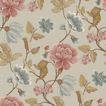 Non-woven wallpaper with vinyl surface, cream background, flowers in shades of beige, brown, gray and pink.