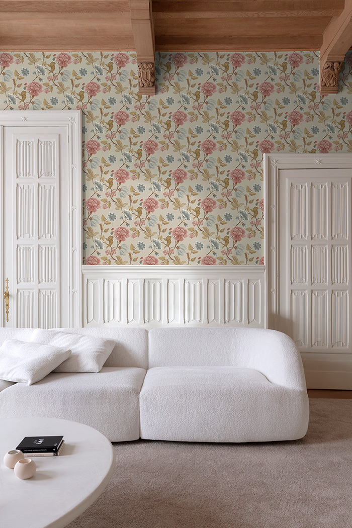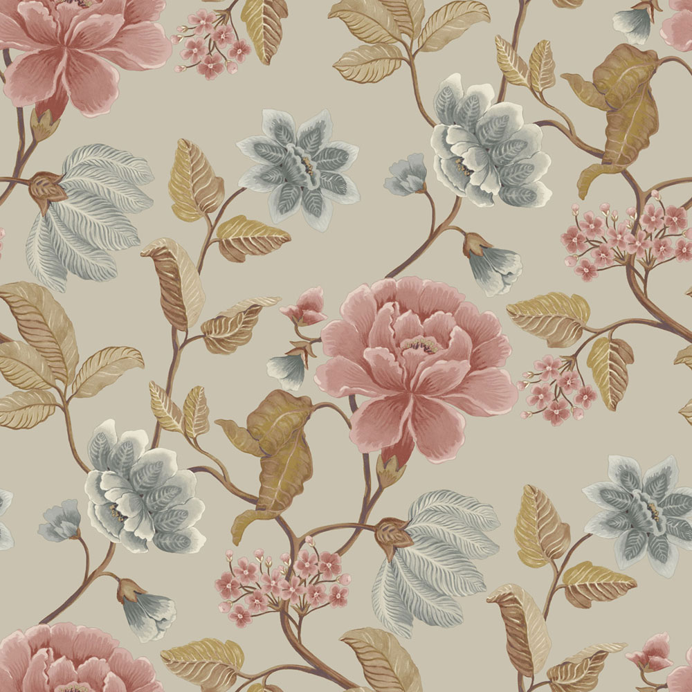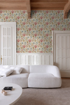 Non-woven wallpaper with vinyl surface, beige background, flowers in shades of pink, brown and gray-blue.