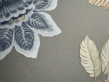 Non-woven wallpaper with vinyl surface, gray-green background, flowers in shades of brown, green, blue and pink.