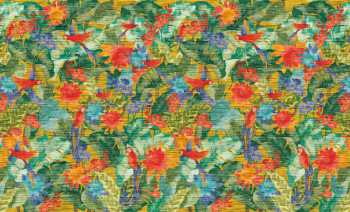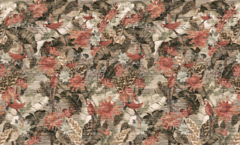 Luxury non-woven wall mural with vinyl surface, coarser texture, motifs of colorful tropical flowers and parrots.