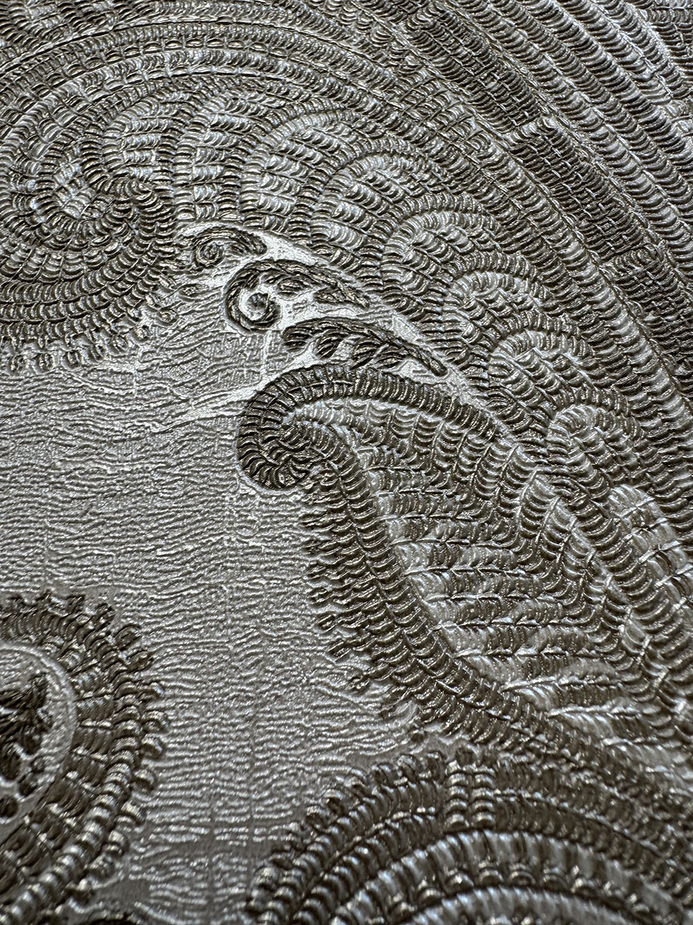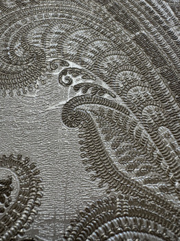 Luxury non-woven wallpaper with vinyl surface, baroque pattern in shades of semi-gloss beige and brown.