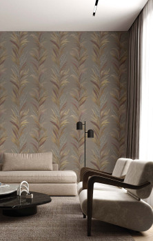 Wallpaper with a vinyl surface, grey-brown striped background with leaf motifs in metallic gold, grey, brown, and purple shades.
