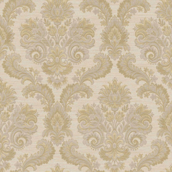 Wallpaper with a vinyl surface, beige and gold-beige tones, palace-style damask pattern, fabric texture.