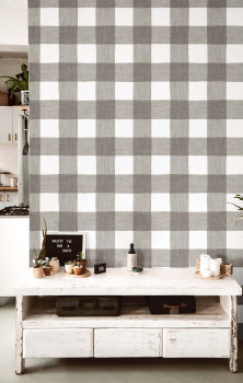 Wallpaper with a vinyl surface, imitation of checkered fabric in black and white tones.