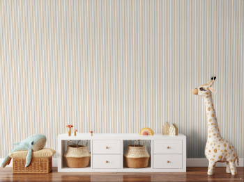 Wallpaper with a vinyl surface, imitation of striped fabric in beige and white tones.