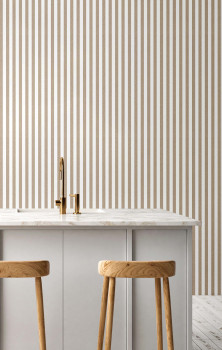 Wallpaper with a vinyl surface, imitation of striped fabric in brown and white tones.