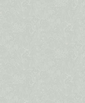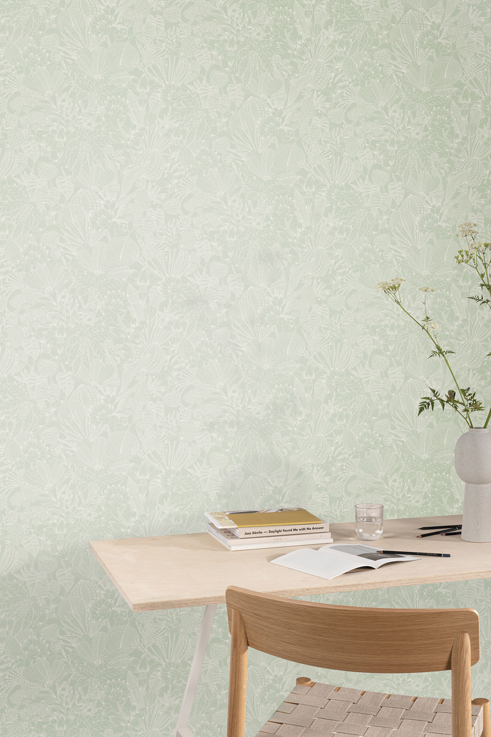 Non-woven wallpaper, pastel grey-green background, white leaf outlines.