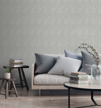 Marvelous geometric non-woven wallpaper. Alternation of smooth and embossed textures in gray shades, silver metallic stripe.