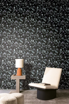 Wallpaper with a black background and a floral pattern in green-blue and purple shades, subtle texture.