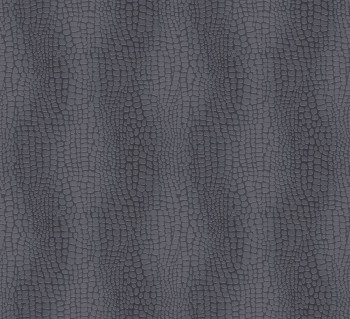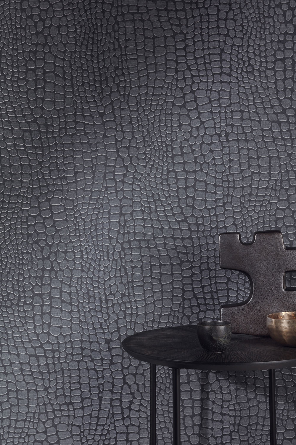 Wallpaper inspired by animal skin, in grey-black shades with silvery grey details.