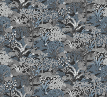 Wallpaper with a nature and wildlife motif in shades of black, grey, and blue.