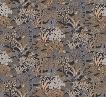 Wallpaper with a nature and wildlife motif in shades of brown, beige, and grey-blue, with metallic semi-gloss accents.