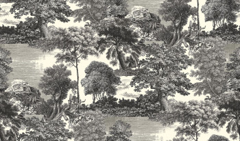 Romantic mural with lightly embossed fabric texture, landscape in shades of grey and black.
