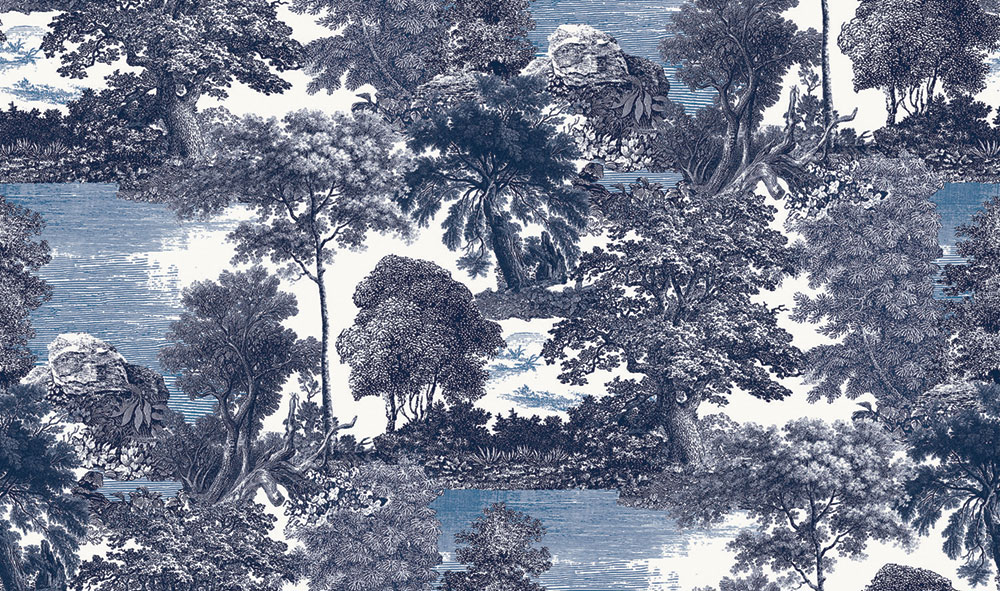 Romantic mural with lightly embossed fabric texture, landscape in shades of blue.