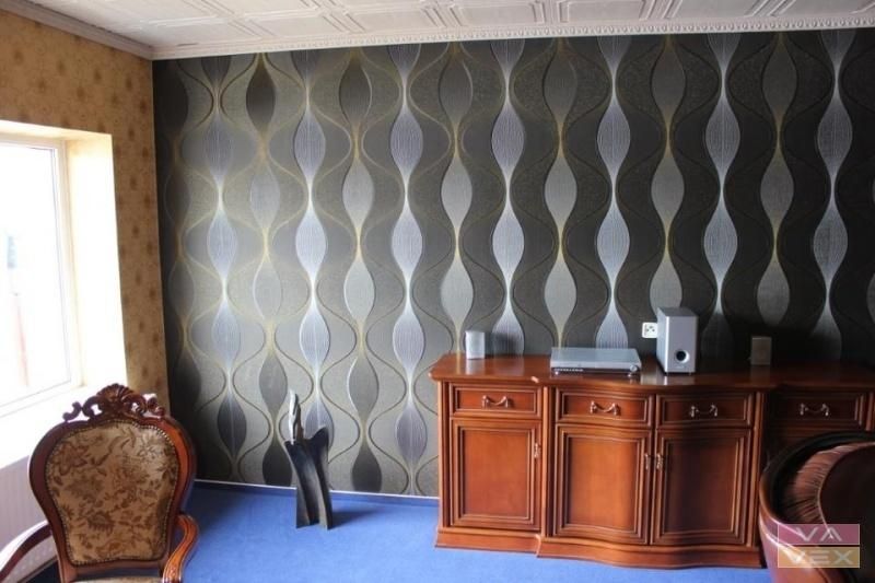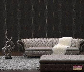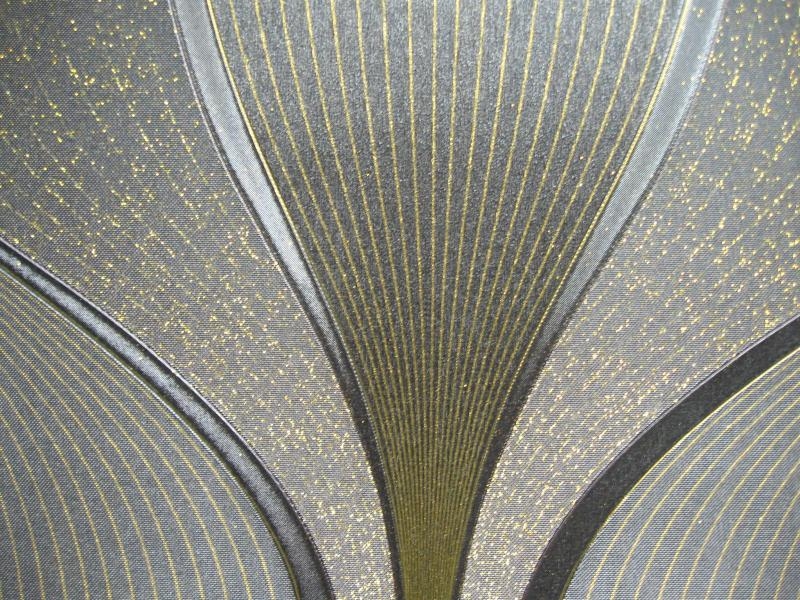 Luxury, elegant black wallpaper with a gold pattern and golden sequins. Non-woven backing, flat vinyl surface.