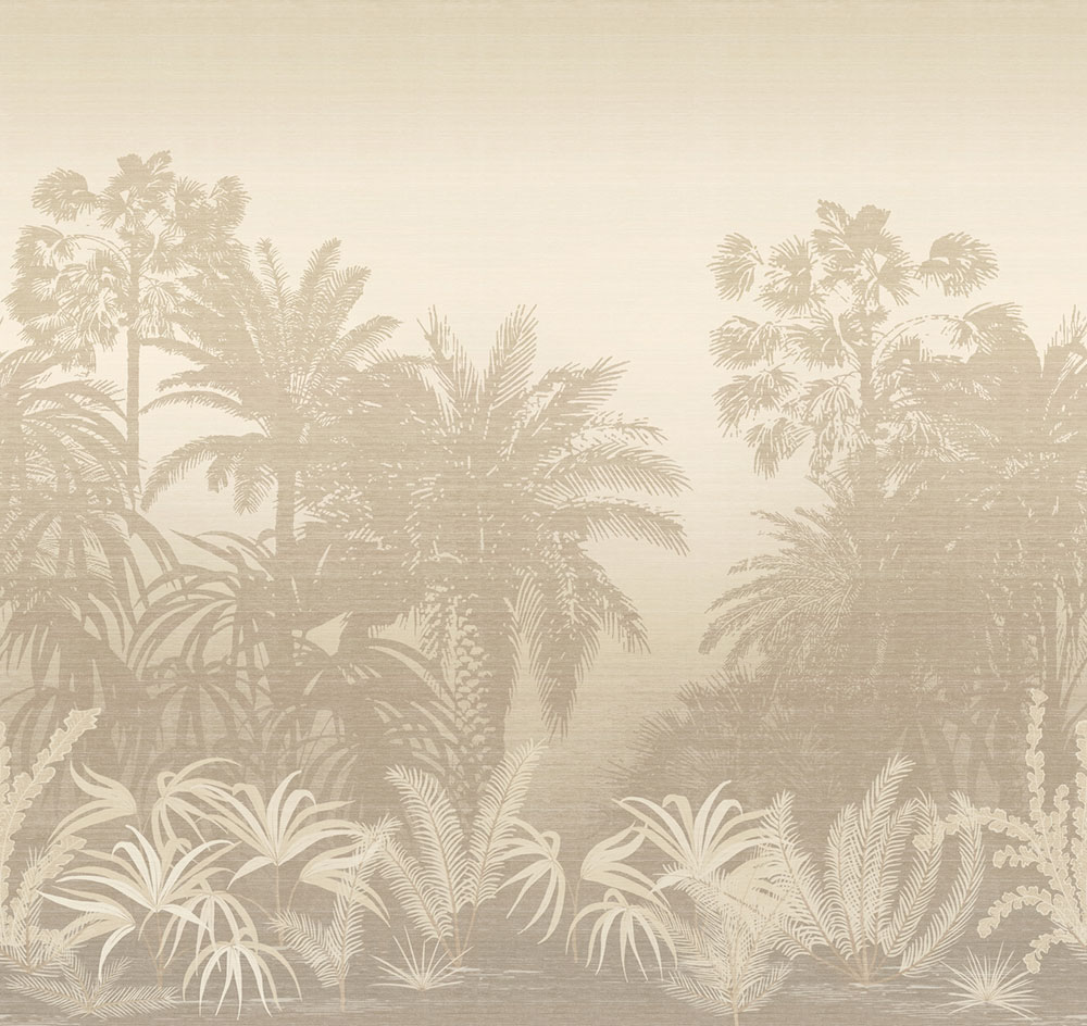 Mural with lightly embossed fabric texture, tropical landscape with palm trees in grey and beige/sand tones.